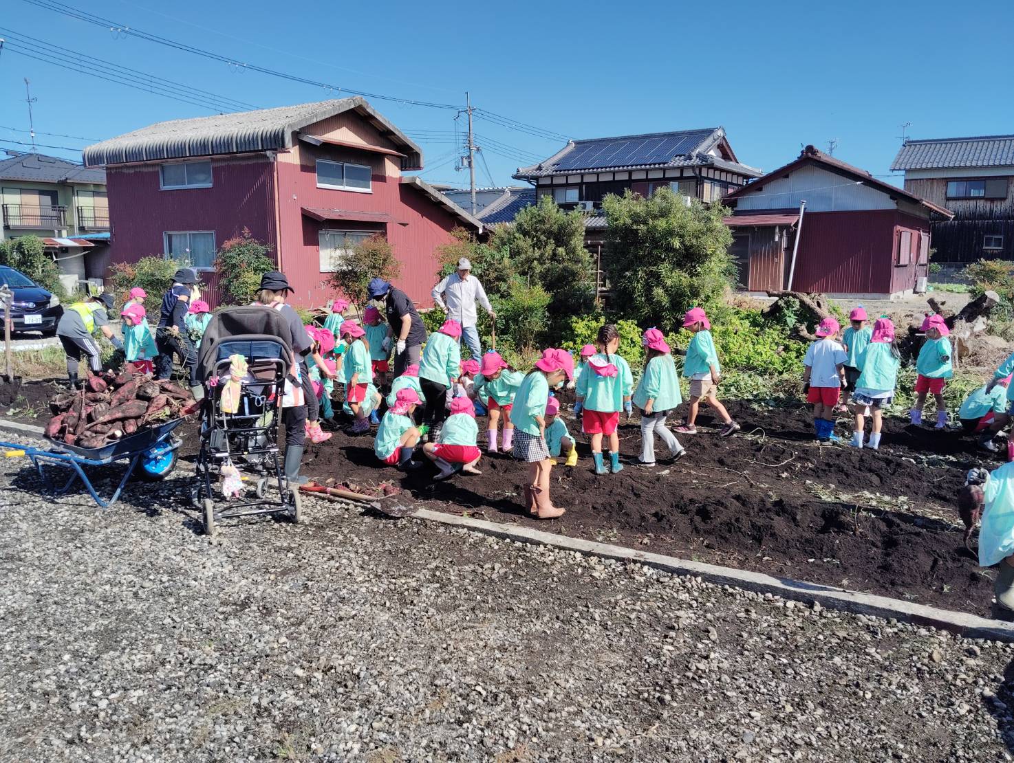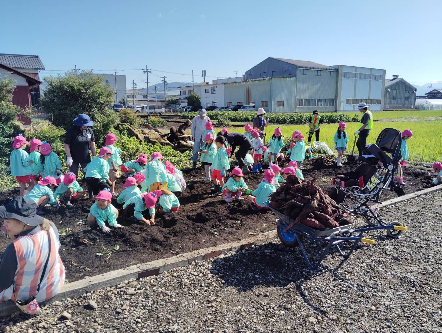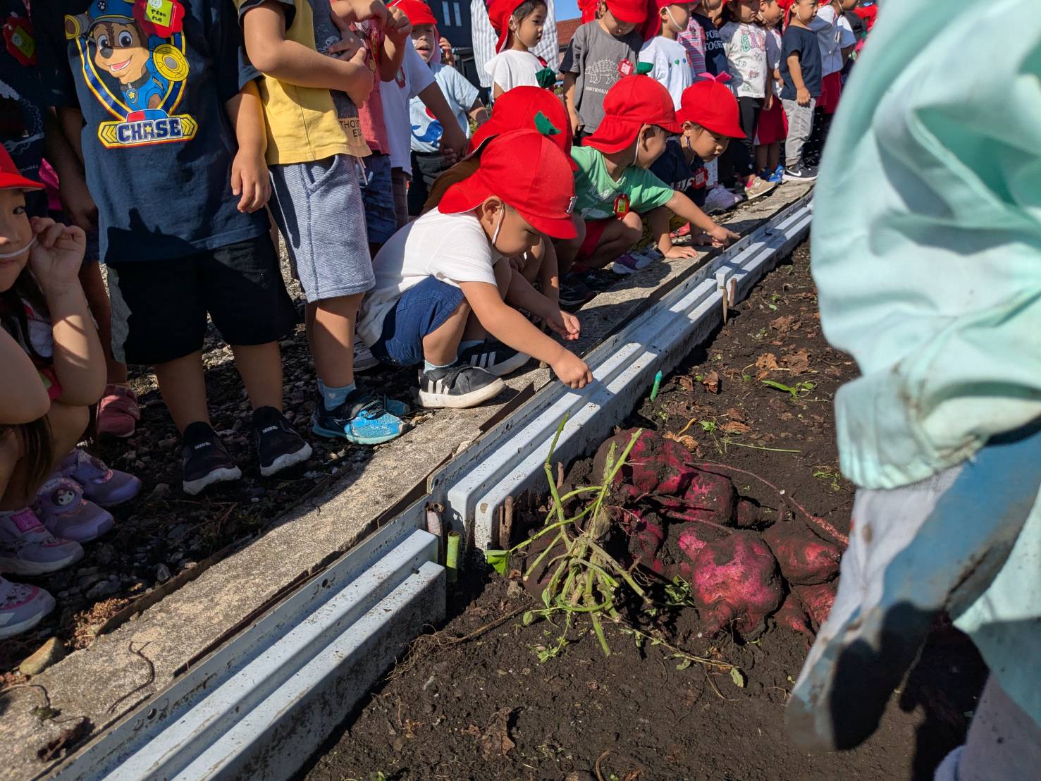 2025年10月17日 ひまわり幼児園のさつまいも収穫体験 10月17日(金)9時30分よりひまわり幼児園の畑でさつまいもの収穫体験のお手伝いをしました。 前日に雨が降り、天気を心配しましたが、当日は秋晴れで大変良いお天気でした。 今年は7月から8月にかけてほとんど雨が降らず大変暑い日が続きました。 異常気象がさつまもの生育にどんな影響を与えているのか心配でしたが、 例年通り大きなさつまいもが収穫できました。 また今年は低学年の園児も見学に来てくれて、さつまいもの収穫体験の応援をしてくれました。