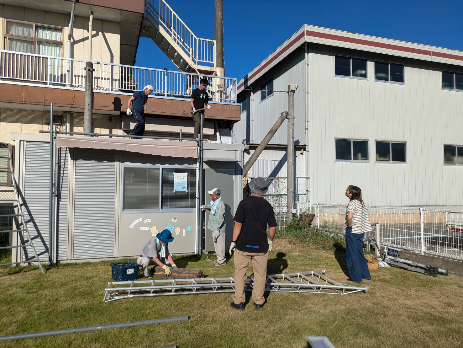 9月2日のコンピスはコンテナハウスによしずを設置いたしました 9月2日(火) 鳥居総監さんのもと、コンピスに参加いただいた方やなんぶ未来会議の皆さんでコンテナハウスによしずを設置いたしました。 まだまだ暑い日が続きます。すこしは涼しくなることを祈ってます。