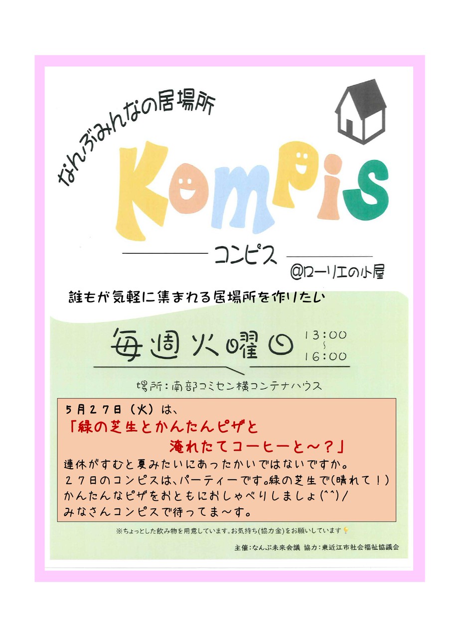 5月になって、南部コミュニティセンターの芝生も緑が濃くなってきました。 5月27日(火)のコンピスは、プチパーティーです。 みなさんお越しくださいね。