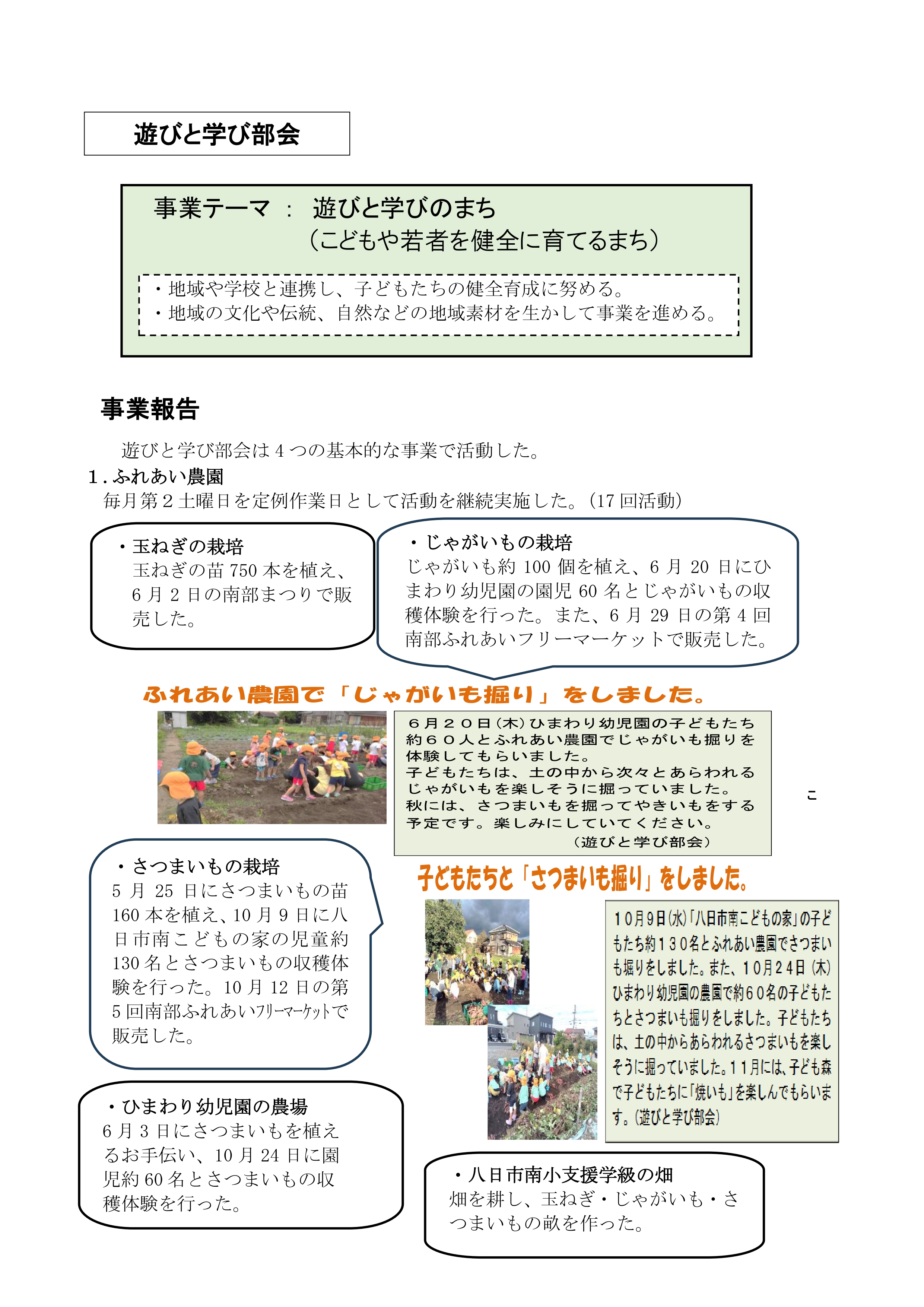 - ・「ふれあい農園」(休耕田の活用)で野菜の収穫体験や子ども森で焼き芋体験(幼児園・南部こどもの家)