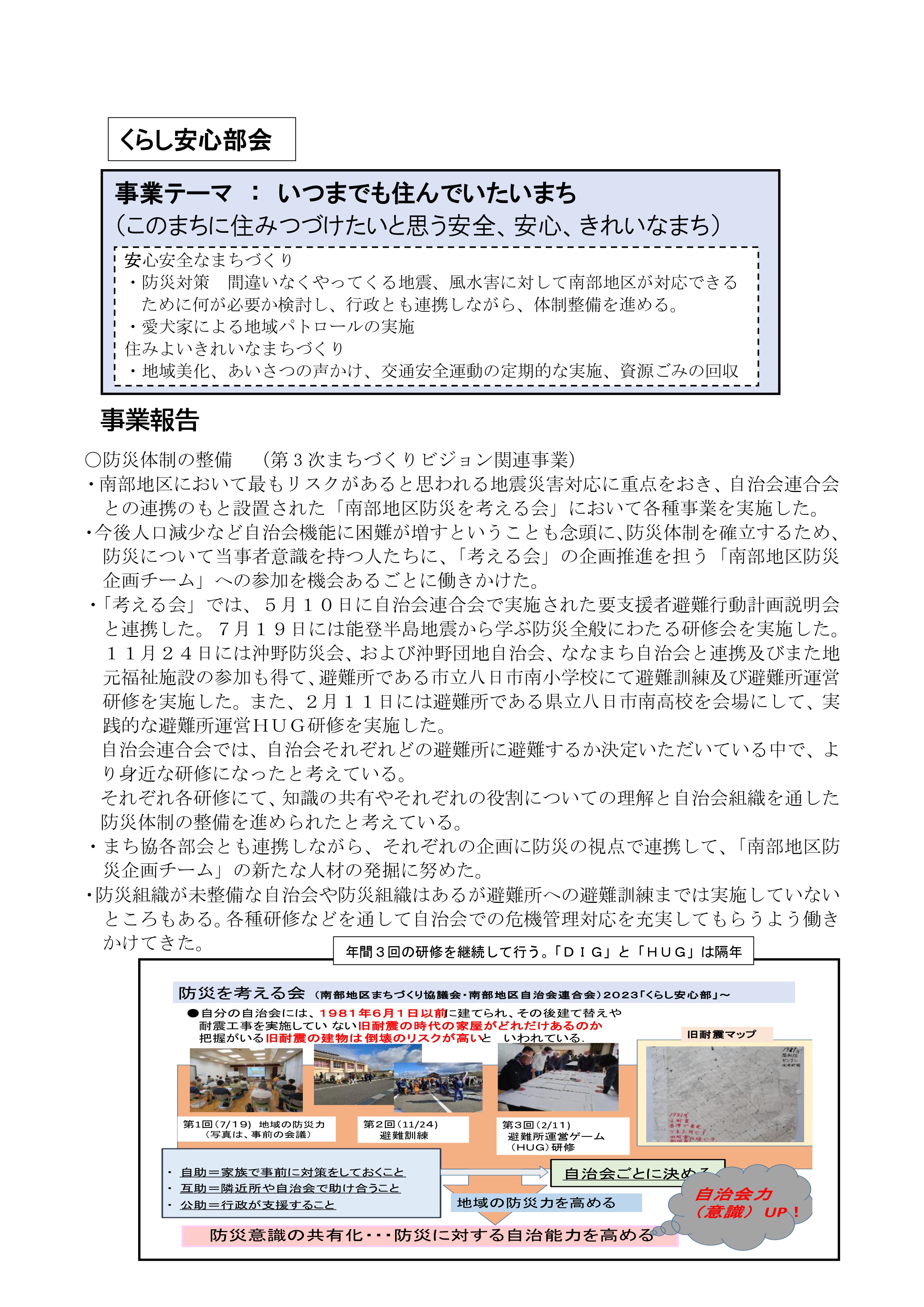 第3条 本会は南部地区住民の参加と総意、責任により、地域が抱える課題を克服し、誰もが地域への愛着と誇りを持って、生き生きと安心して暮らせるまちづくりに資することを目的とする。