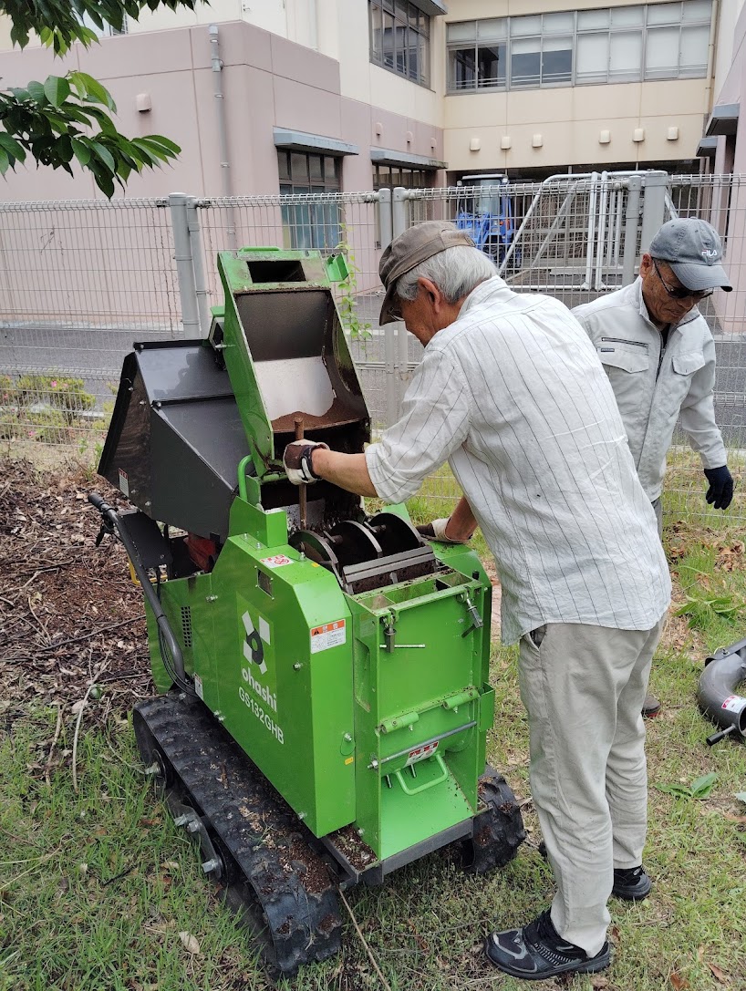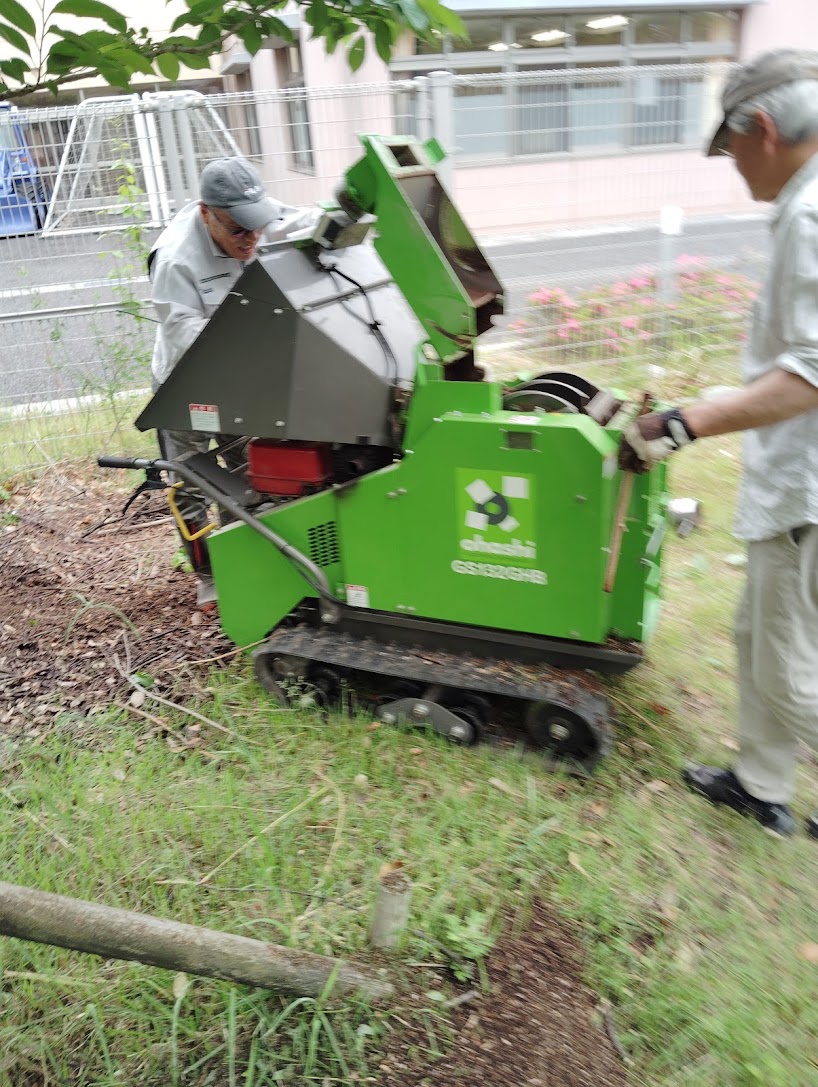5月28日(水)9時より、子ども森で市から借りたチッパーを使い剪定枝を粉砕しました。10cm以上の木も粉砕できるようで、また秋になったら借りようと思います。