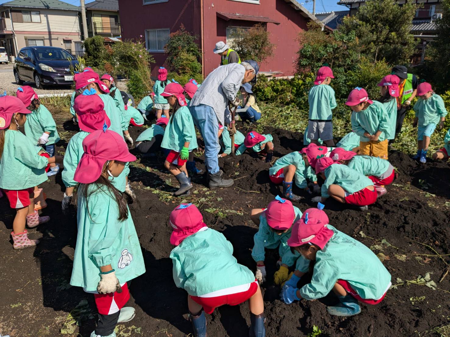 2025年10月17日 ひまわり幼児園のさつまいも収穫体験 10月17日(金)9時30分よりひまわり幼児園の畑でさつまいもの収穫体験のお手伝いをしました。 前日に雨が降り、天気を心配しましたが、当日は秋晴れで大変良いお天気でした。 今年は7月から8月にかけてほとんど雨が降らず大変暑い日が続きました。 異常気象がさつまもの生育にどんな影響を与えているのか心配でしたが、 例年通り大きなさつまいもが収穫できました。 また今年は低学年の園児も見学に来てくれて、さつまいもの収穫体験の応援をしてくれました。