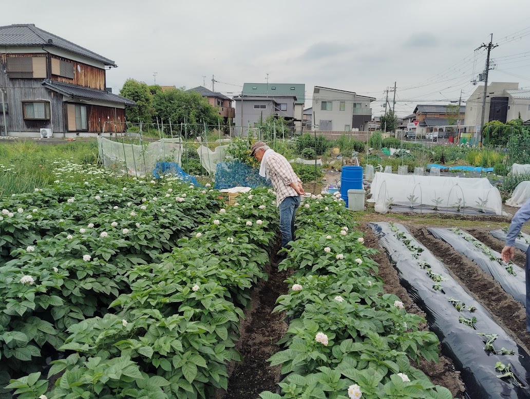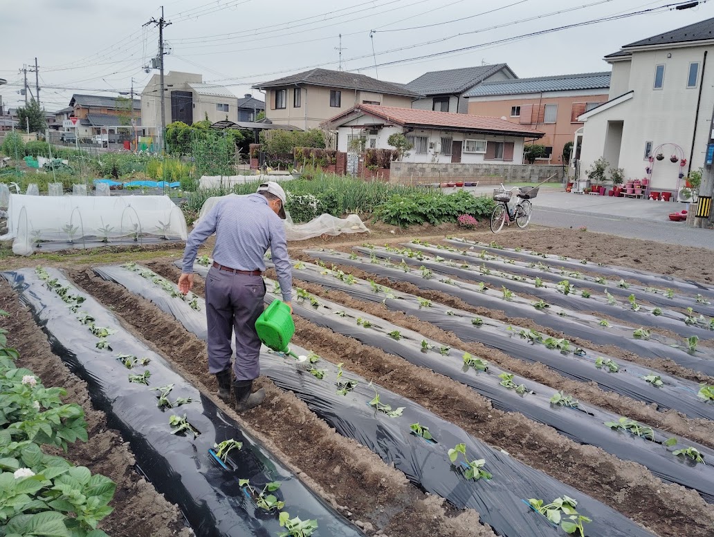 5月16日 ひまわり幼児園の畑、ふれあい農園での作業 5月16日(金)9時よりひまわり幼児園の畑に集まって21日のさつまいも植えのため畝を3列作りました。それからふれあい農園へ行きさつまいものツル苗150本を植えました。。