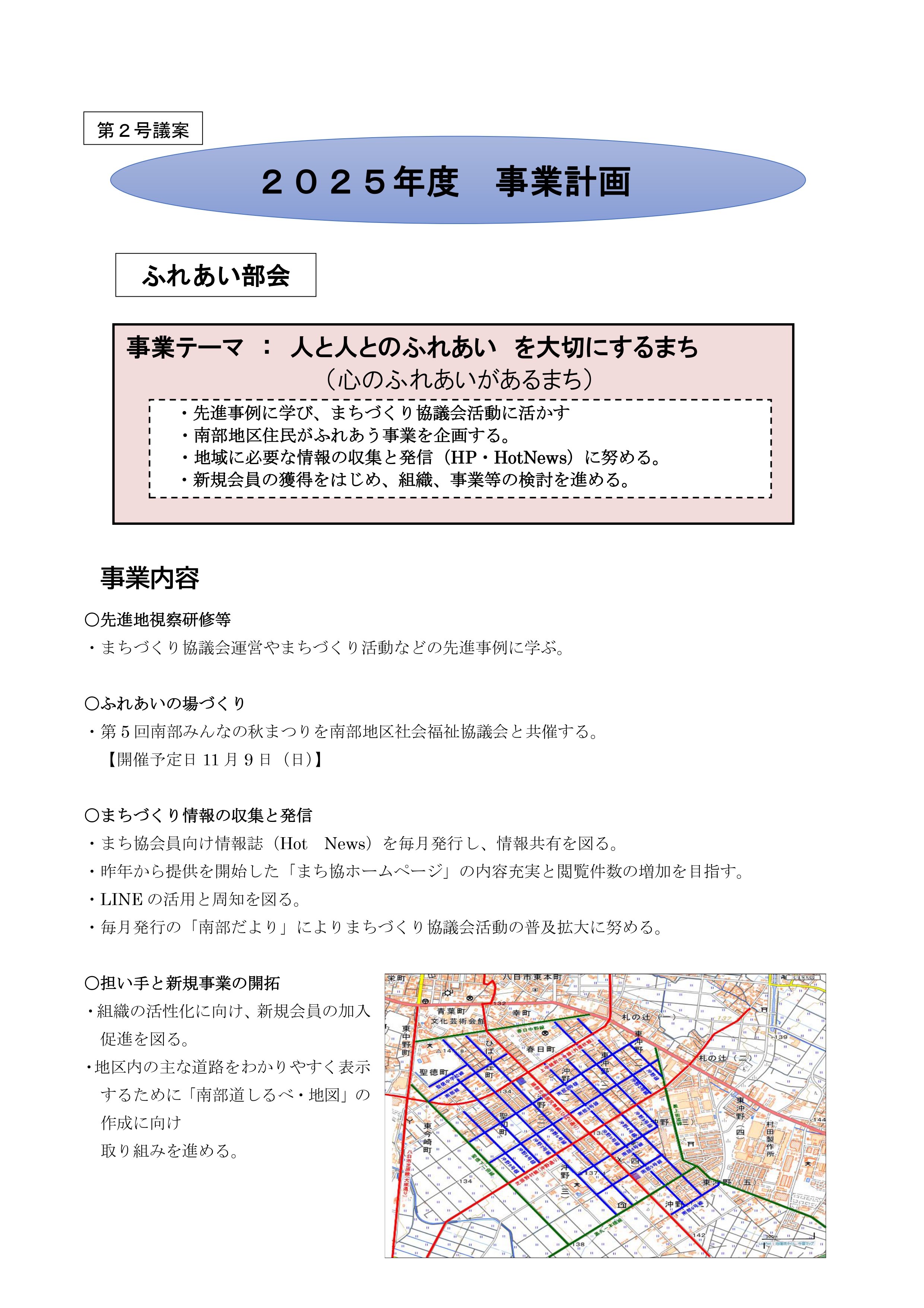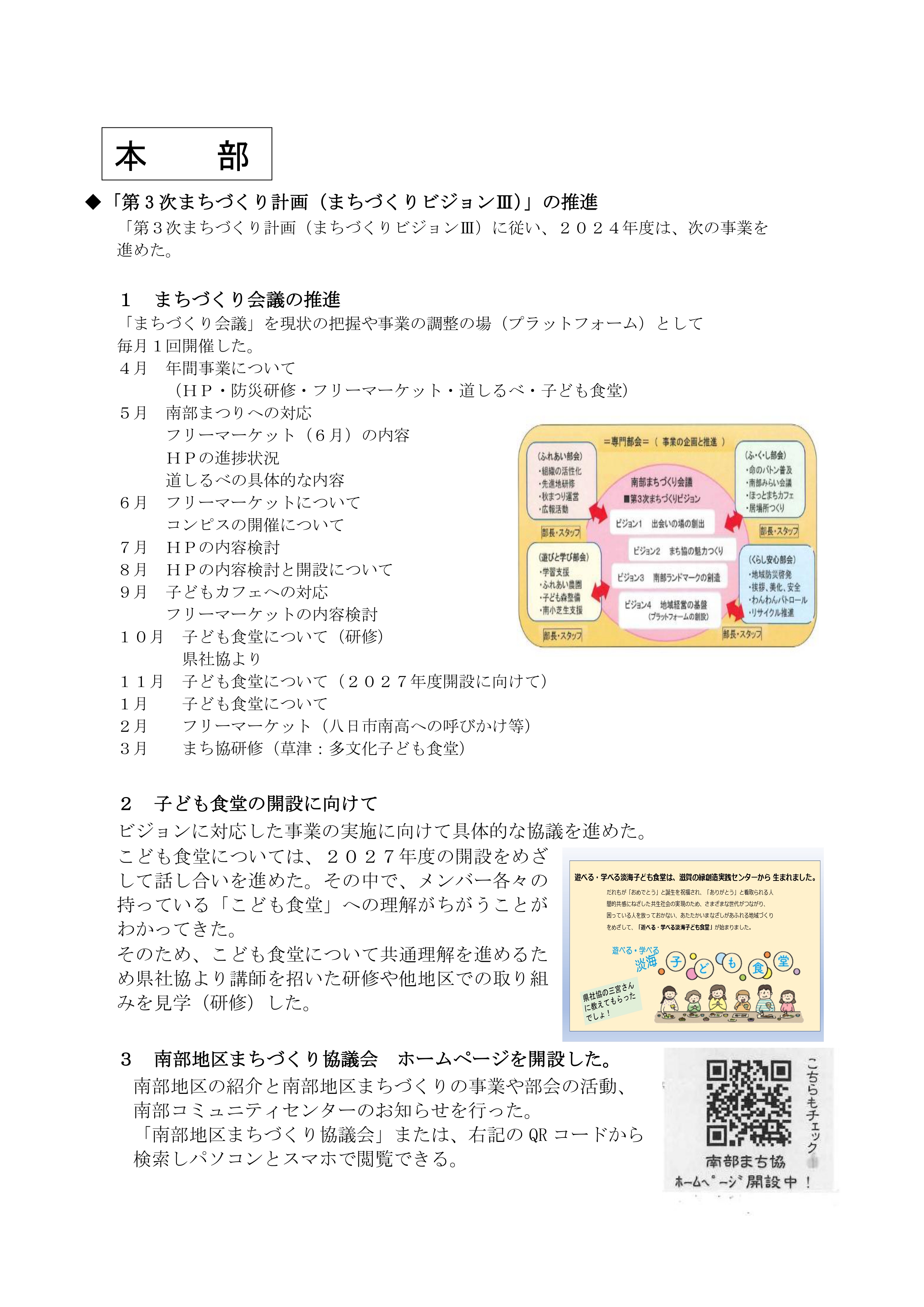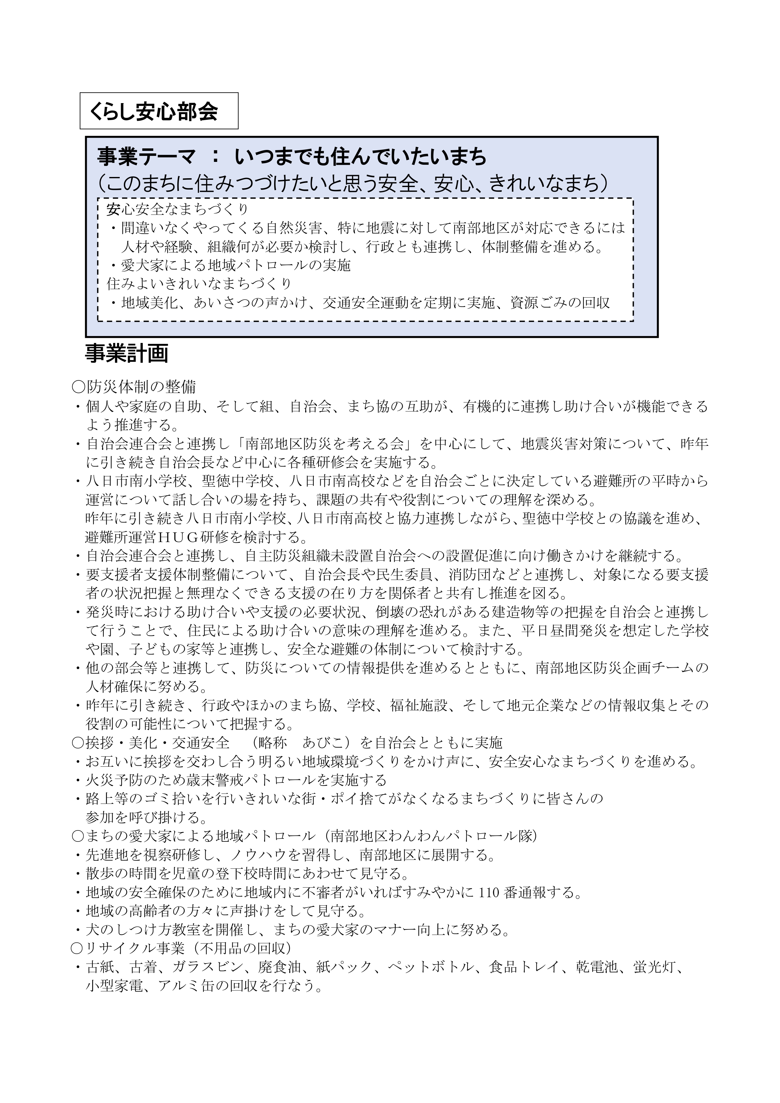 第3条 本会は南部地区住民の参加と総意、責任により、地域が抱える課題を克服し、誰もが地域への愛着と誇りを持って、生き生きと安心して暮らせるまちづくりに資することを目的とする。